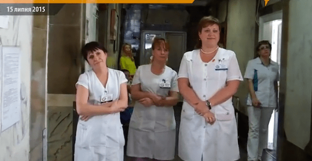 Hospital and other attendees present at award ceremony in the hospital corridor, including Dr. Serhiy Ryzhenko, Chief Doctor at Mechnikov Regional Clinical Hospital in Dnipropetrovsk (in white).