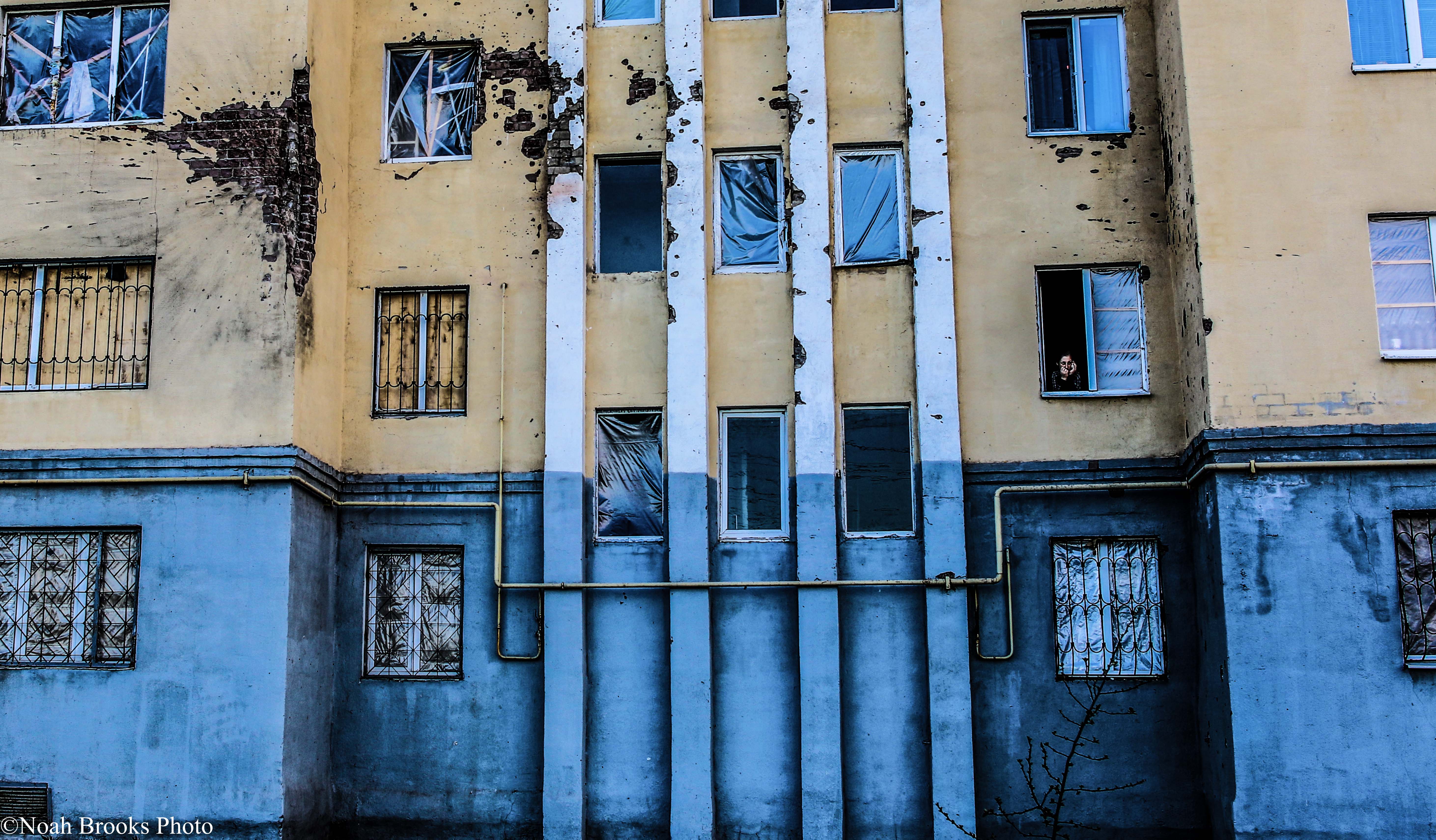 A woman looks out her apartment window where separatists killed 30 and wounded nearly 100 in a rocket attack earlier this year. Photo: Noah Brooks