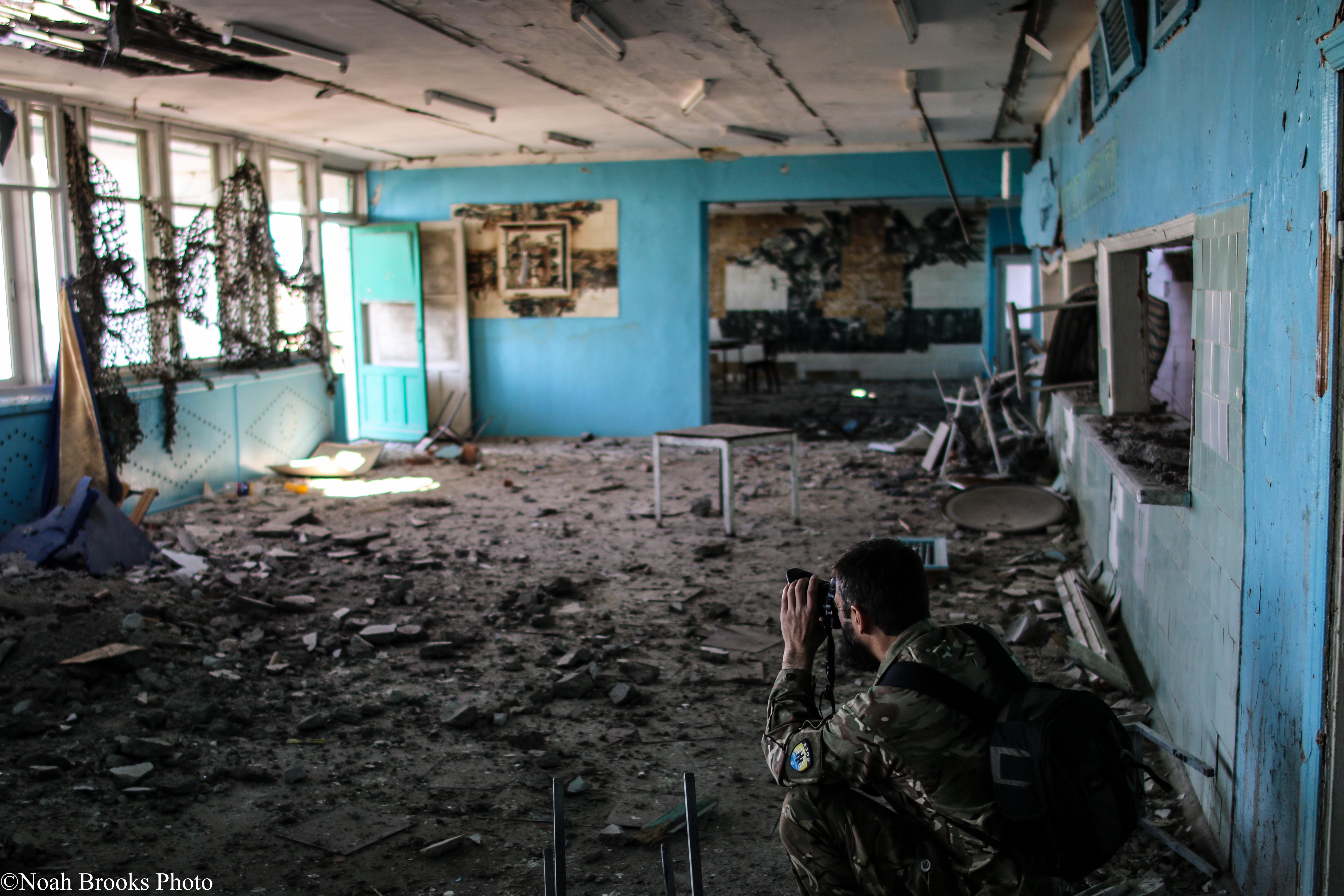 Azov photographer Ruslan photographs damage to a school. Photo: Noah Brooks