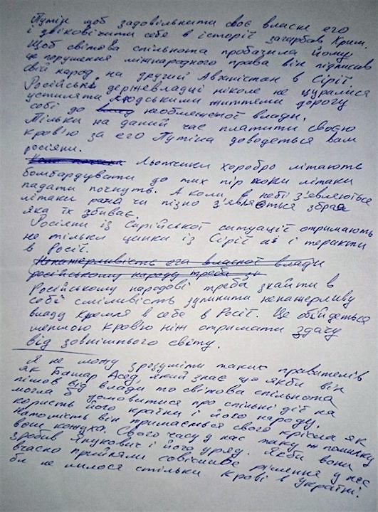 (Today I received a note with her thoughts, and am sharing it):“Putin, to satisfy his own ego and immortalize himself in history, invaded Crimea. So that the international community would forgive him this violation of international law, he signed his people up for a second Afghanistan in Syria. Russian statesmen have never shunned paving the way for themselves with human lives on the path to absolute power.