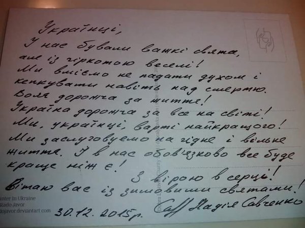 By Nadiya Savchenko, on a Rado Javor postcard posted by her sister Vira Savchenko