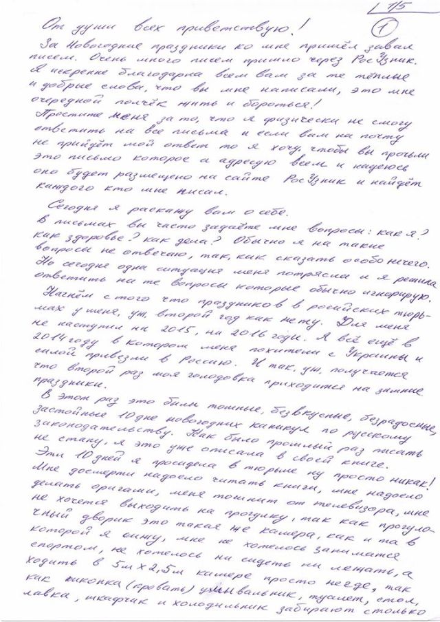 To begin with, this is the second year of me not celebrating New Year’s in Russian prisons. For me, neither 2015 nor 2016 came around. I’m still in 2014, the year when I was kidnapped from Ukraine and brought to Russia by force. And so it happens out that this is the second time my hunger strike coincides with the winter holidays.
