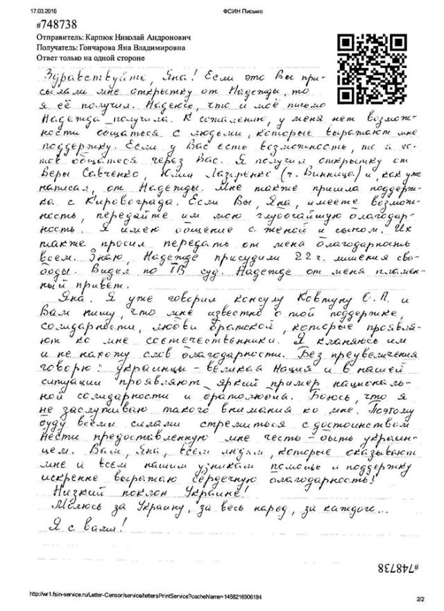 If it was you who sent me the postcard from Nadiya [Savchenko], I received it. I hope that Nadiya also received my letter. Unfortunately, I have no way to communicate with the people who express their support for me. If you have that possibility, I am ready to communicate [with them] through you. I received a postcard from Vira Savchenko, Yuliya Lazarenko (from Vinnitsa) and, as I’ve mentioned, from Nadiya. I also received support from Kirovohrad. If you, Yana, have the opportunity, give them my deepest gratitude. I am able to communicate with my wife and son. I also asked them to thank everyone from me. I know that Nadiya was sentenced to 22 years of imprisonment. I saw the trial on TV. Fondest greetings from me to Nadiya.