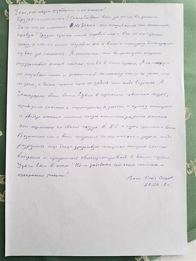 “Friends, here is the letter that Oleg Sentsov wrote today in the colony and asked to convey to everyone who has supported and supports him these days”: