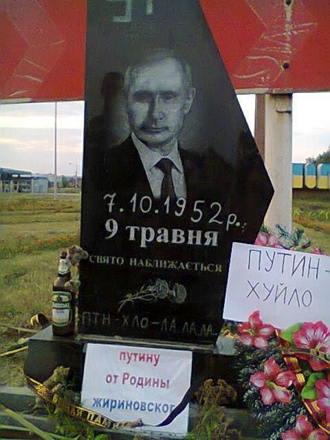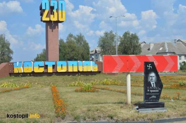 Earlier, the local organization of the “Right Sector” party held an action, “Putin’s Funeral.” They installed a tombstone with his image at the entrance to Kostopil from the direction of Rivne. On the monument are the following dates: 07.10.1952 – 05.09.